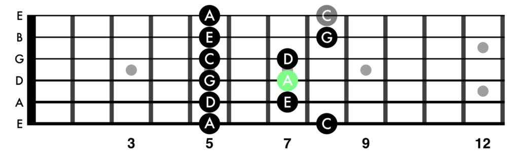 - Find A on the low E string (5th fret)